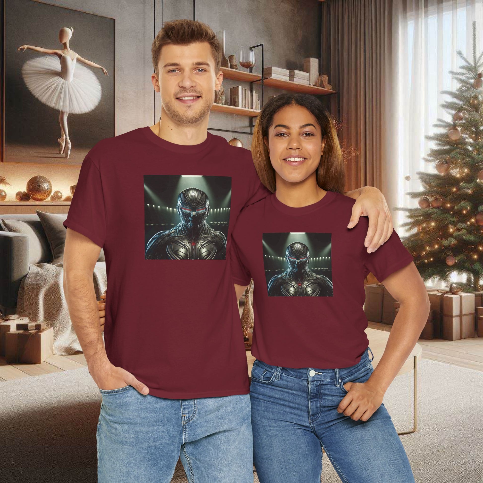 A really cool, film noir, highly detailed portrait of a cyberpunk mask. The lighting from above highlights the texture and provides shadows, giving a mysterious and edgy vibe. This T-Shirt is perfect for cyberpunk enthusiasts and those who appreciate intricate design. Ideal for wearing to sci-fi conventions, or as a statement piece for everyday wear. Product features - 100% cotton for year-round comfort - Classic fit for a comfy, relaxed wear - Ribbed knit collar for shape retention - Ethically grown and harvested US cotton - Certified by Oeko-Tex for safety and quality assurance Care instructions - Machine wash: warm (max 40C or 105F) - Non-chlorine: bleach as needed - Tumble dry: medium - Do not iron - Do not dryclean
