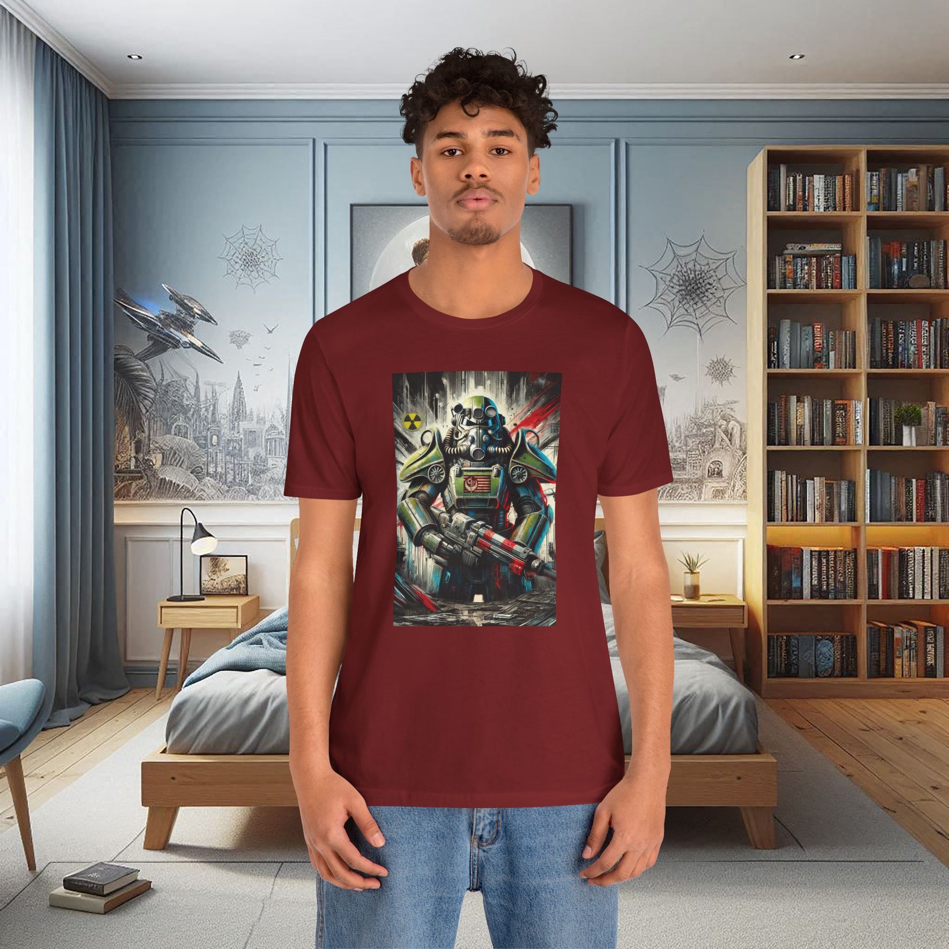 A futuristic green power armor design on a black unisex jersey short sleeve tee, featuring a soldier with a red-and-silver futuristic rifle in a neo-expressionist art style. The gritty post-apocalyptic atmosphere is enhanced by bold red, white, and black brush strokes, a red flag with gear symbols, and a yellow radiation symbol. Perfect for sci-fi enthusiasts and fans of dystopian themes, great for casual wear or as a statement piece.